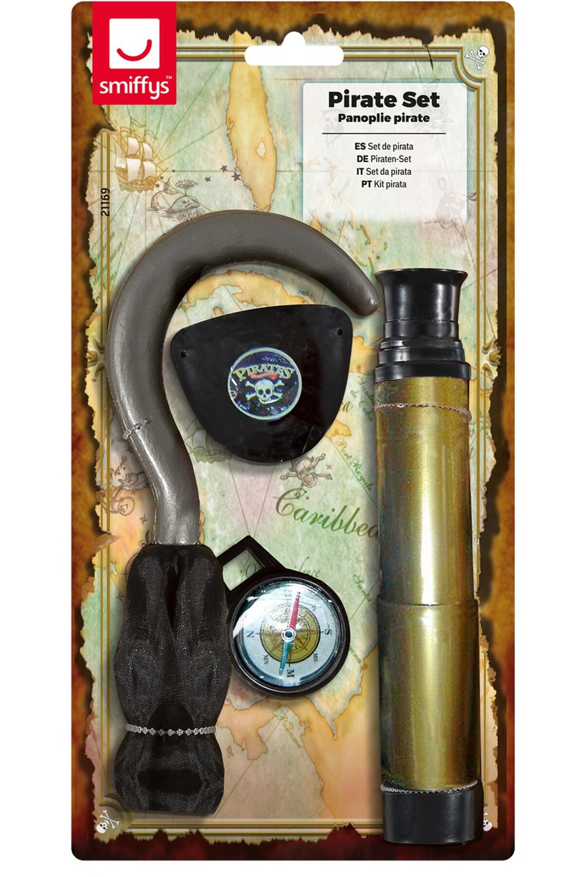 Комплект Пират се състои от превръзка за око, телескоп, компас и кука за ръка. Подходящ аксесоар за Хелоуин, парти, карнавал, училищни празненства и всякакви забавления.