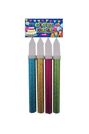 Фонтани за торта, цветни, 10 см, 4 броя в опаковка, с продължителност на горене 35 секунди и цветни искри. Подходящи за Рожден ден, Нова Година, парти и карнавал. ИНСТРУКЦИИ ЗА БЕЗОПАСНОСТ: Поставете изделието в мек материал, в изправено положение. Стоейки отстрани запалете запечатващата хартия и осигурете безопасно разстояние между вас и изделието от най-малко 1 метър. Да не се възпламенява в близост до леснозапалими материали! Изделието не се държи в ръка. Задължителен родителски контрол! Неправилната употреба може да доведе до нараняване или пожар. Да се съхранява на сухо и проветриво място. Забранено за употреба от лица под 12 год.