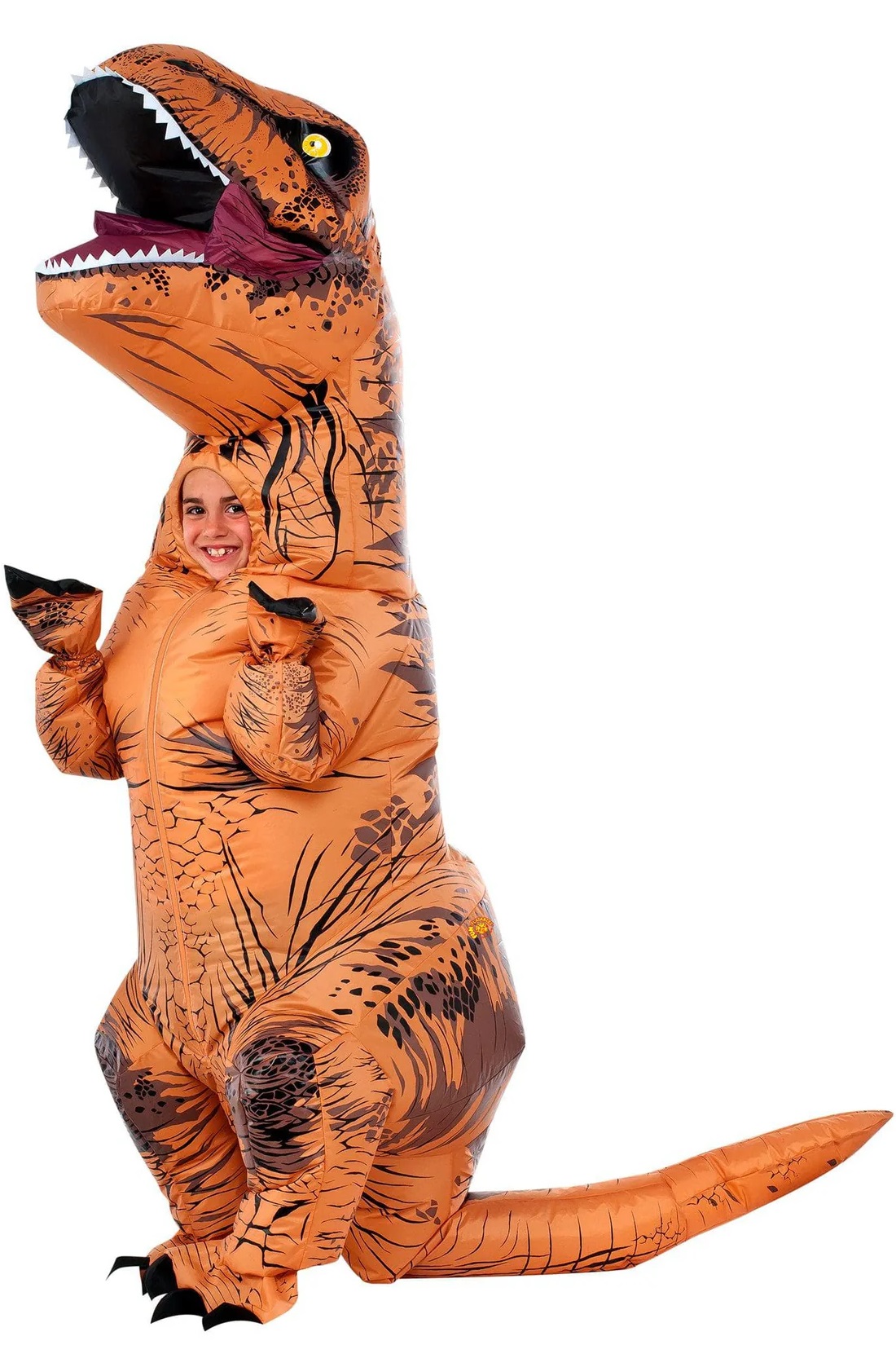 Костюм Динозавър Т-Рекс, зелен. Предлага се с машинка, която работи с 4 броя батерии АА (не са включени в комплекта). Машинката надува костюма за 60 секунди и го поддържа надут за приблизително седем часа. Изработен е от лек материал. Подходящ за Хелоуин, парти, карнавал и забави. Размер за деца.