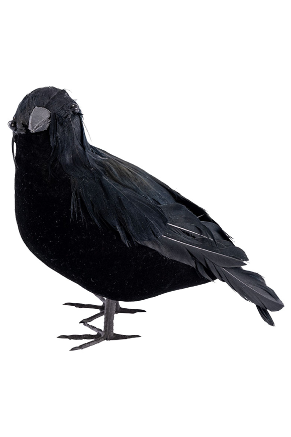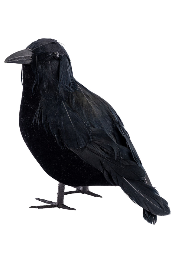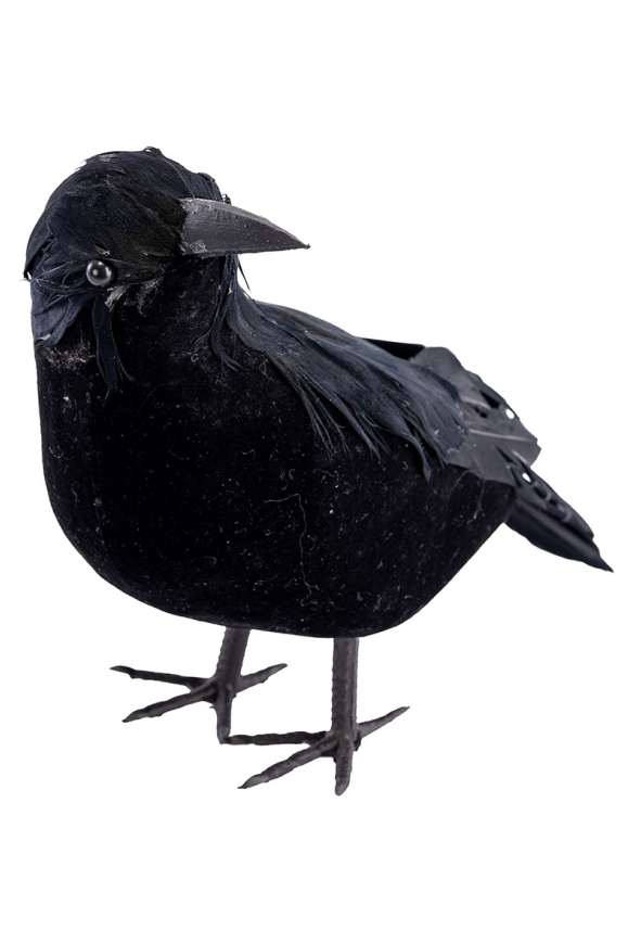 Гарван с височина 16 см е изработен от пластмаса, велур и пера. Подходящ е за декорация за Хелоуин и други забавления.