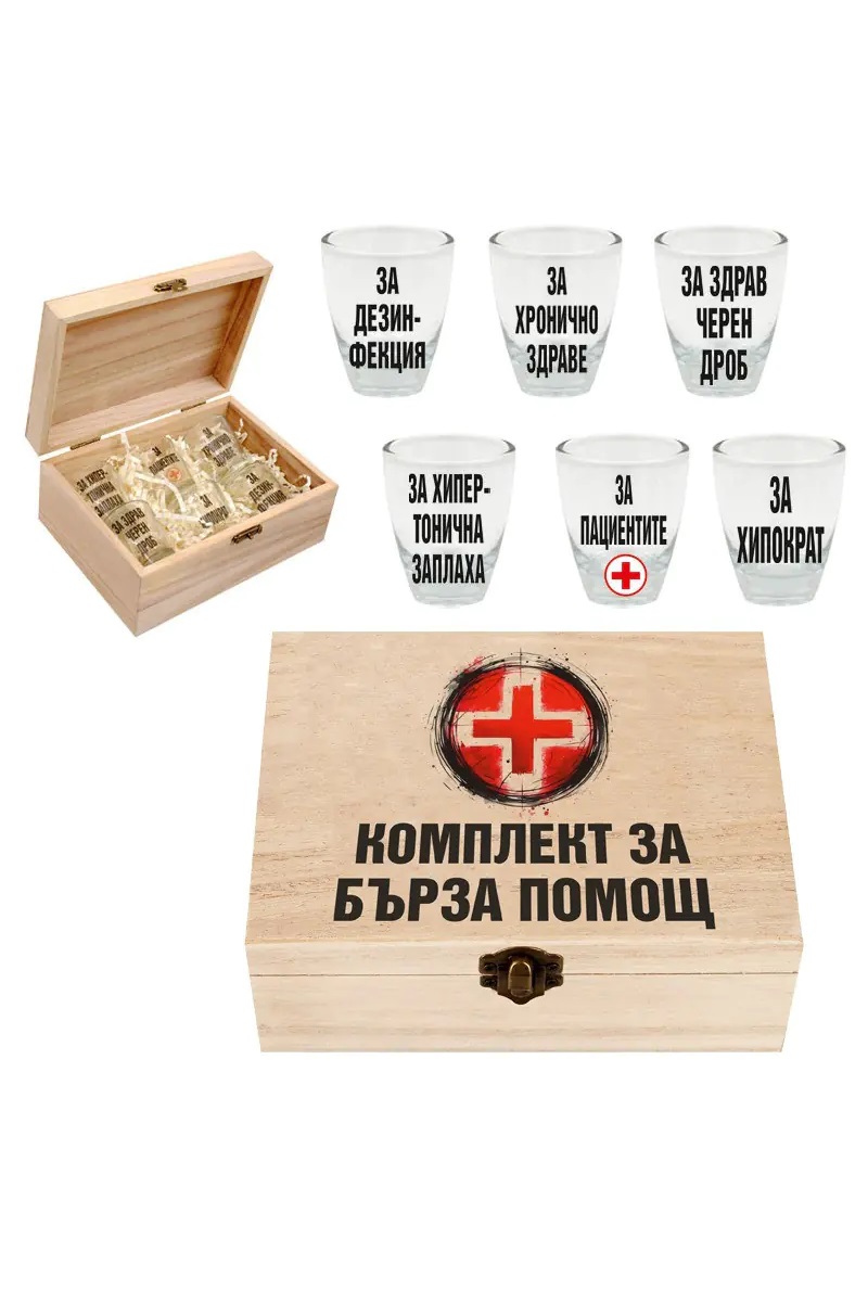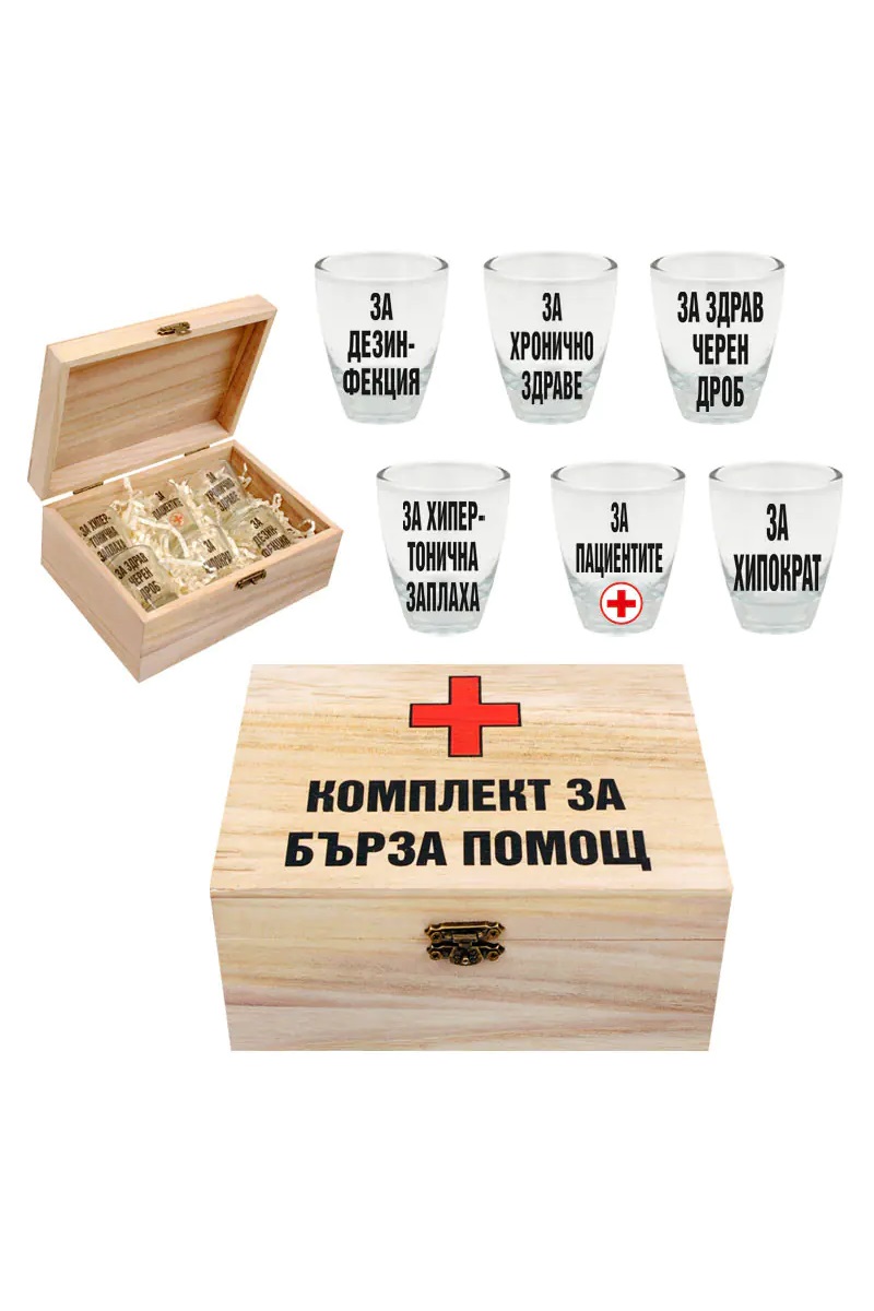 Комплект от 6 броя весели стъклени шотове "КОМПЛЕКТ ЗА БЪРЗА ПОМОЩ" в дървена кутия с размери 17 х 12,5 х 8 см. Страхотен подарък за рожден ден, имен ден, Трифон Зарезан и други поводи.