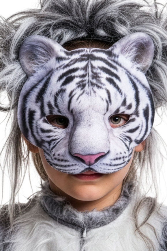 Маска бял Тигър, детска е изработена от плат. Подходяща е за Хелоуин, маскарад, училищни празненства, парти, бал с маски и забави.