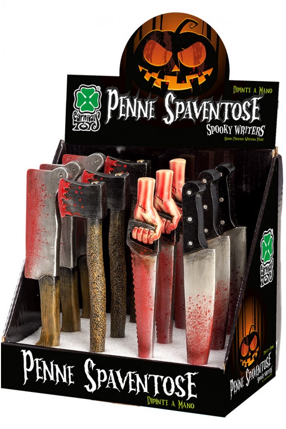 Ефектна химикалка с оръжия и черно мастило. Предлага се в четири варианта - нож, трион, брадва или сатър. Подходящ подарък за Хелоуин или други поводи.