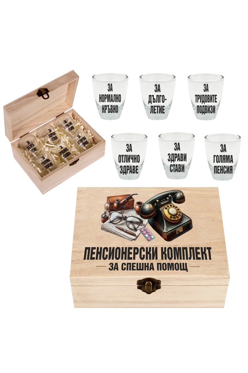 Комплект от 6 броя весели стъклени шотове "ПЕНСИОНЕРСКИ КОМПЛЕКТ ЗА СПЕШНА ПОМОЩ" в дървена кутия с размери 17 х 12,5 х 8 см. Страхотен подарък за рожден ден, имен ден, Трифон Зарезан и други поводи.