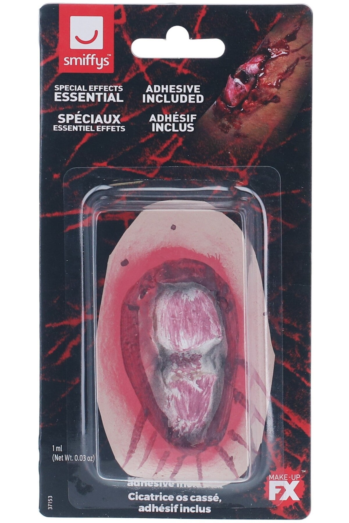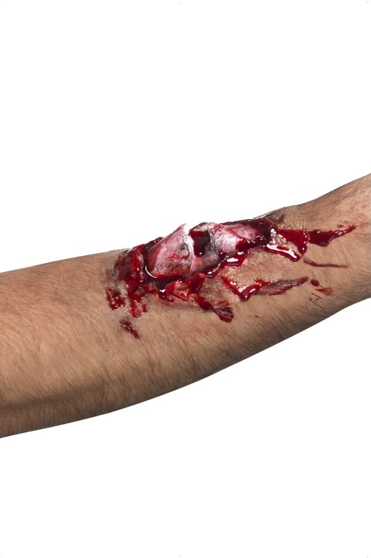 Релефна татуировка, имитираща отворена рана с изкочила счупена кост се предлага в комплект с 1 мл течно лепило за кожа, с което да залепите татуировката на желаното място. Изработена от натурален каучуков латекс. Особено ефектен и бърз начин да се включите в празнуването на Хелоуин. Начин на употреба: 1. Залепете татуировката с помощта на лепилото в комплекта (върху чиста и суха кожа). 2. За по-добър ефект се снабдете с грим и изкуствена кръв, които да приложите около и върху татуировката. Стара цена: 12.00 лв