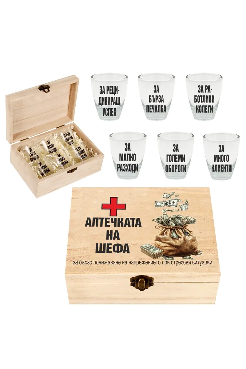 Комплект от 6 броя весели стъклени шотове "АПТЕЧКАТА НА ШЕФА" в дървена кутия с размери 17 х 12,5 х 8 см. Страхотен подарък за рожден ден, имен ден, Трифон Зарезан и други поводи.