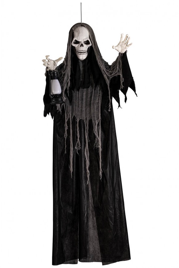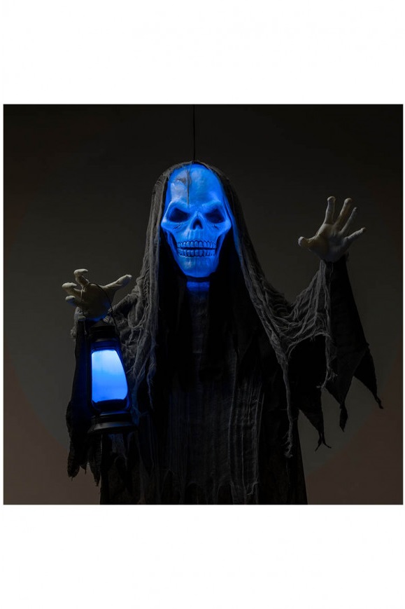 Скелет - висящ с черна туника и светеща лампа и череп със звук е изработен от пластмаса и плат, с височина 180 см. Подходящ е за декорация за Хелоуин и други забавления.