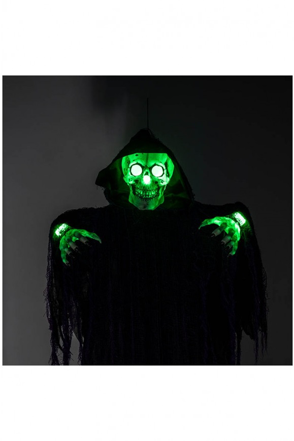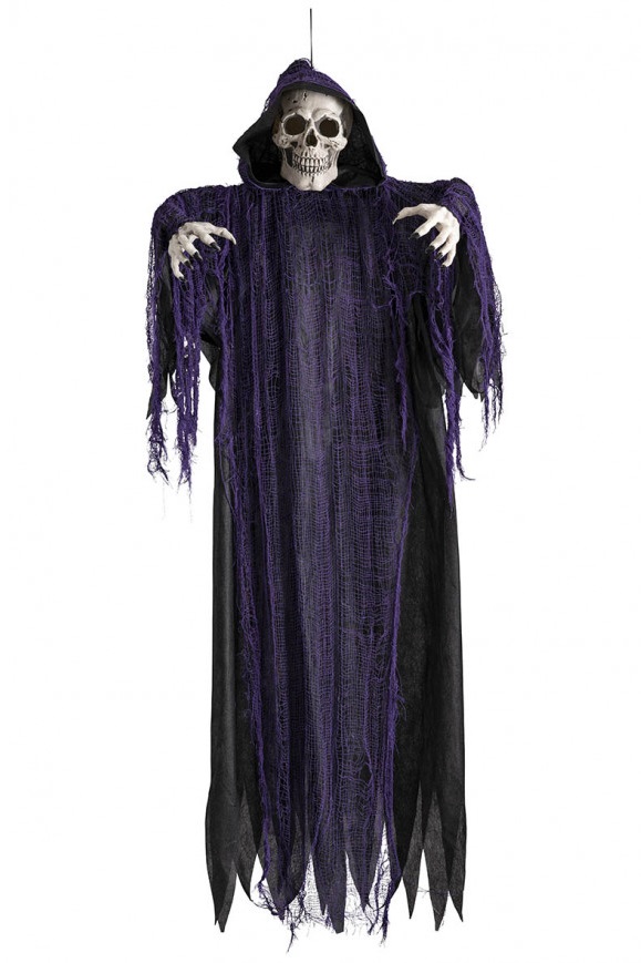 Скелет - висящ с черно-лилава туника и светещ череп и ръце със звук е изработен от пластмаса и плат, с височина 160 см. Подходящ е за декорация за Хелоуин и други забавления.