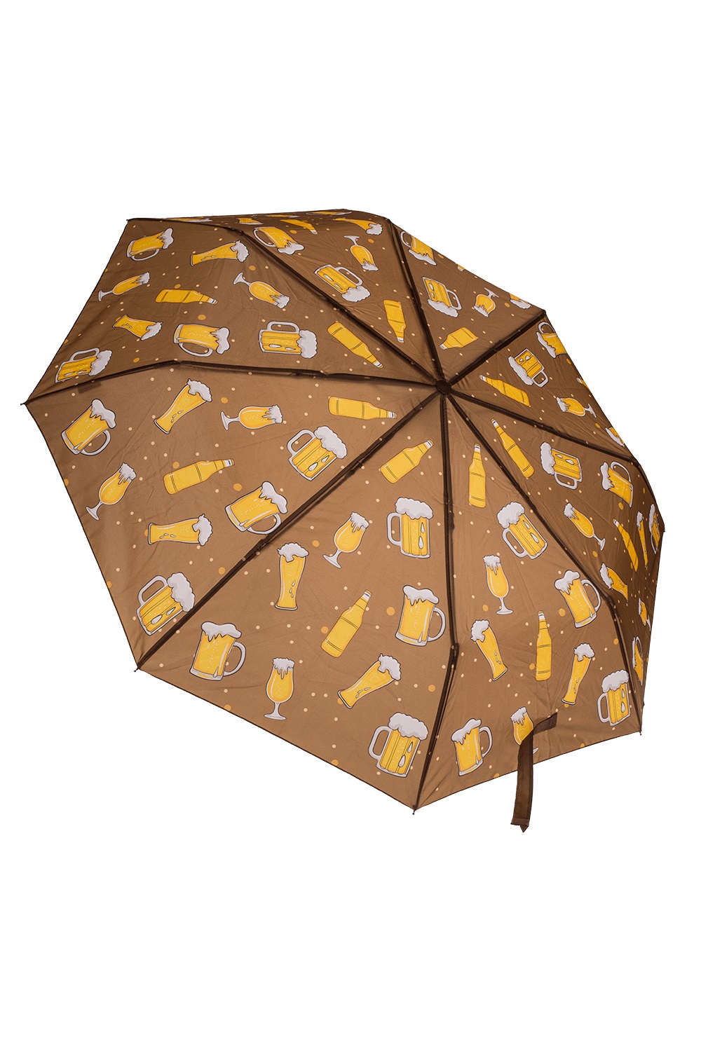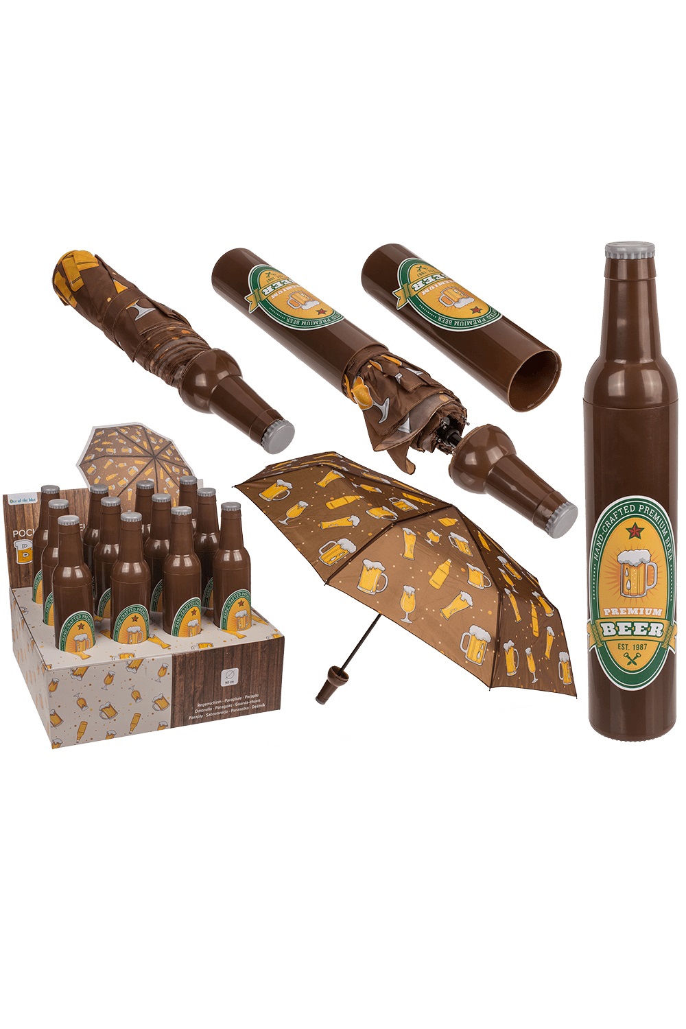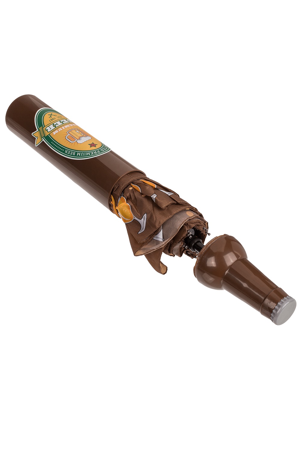 Джобен Чадър в Бутилка Бира - кафяв с принт на бири. Подходящ аксесоар за слънчев или дъждовен ден, парти, карнавал и забавен подарък за любителите на бира.