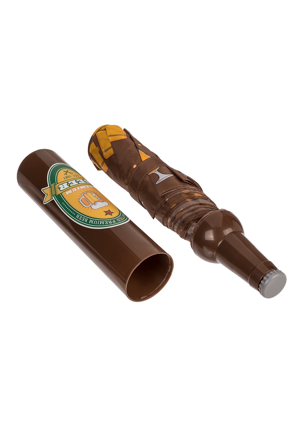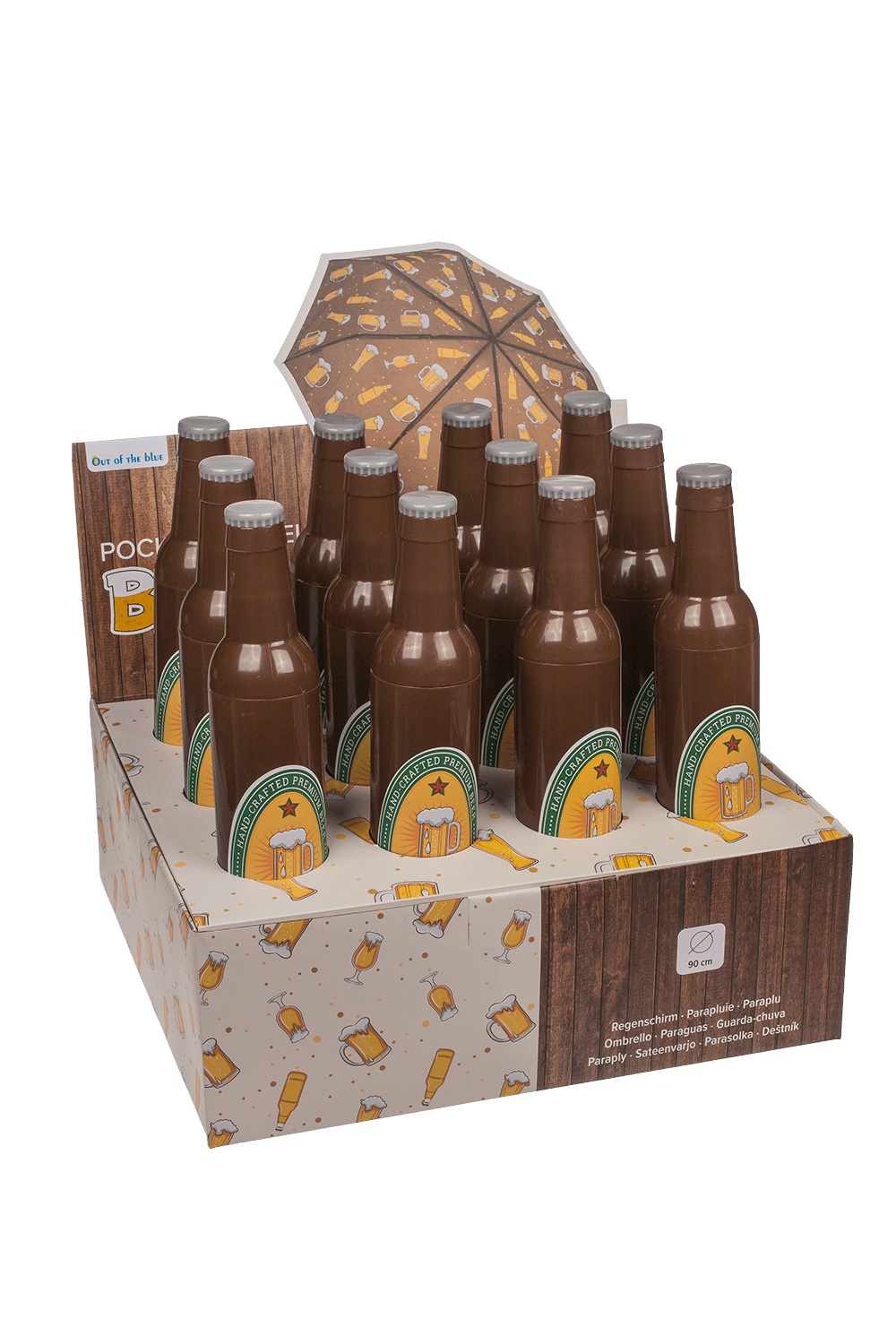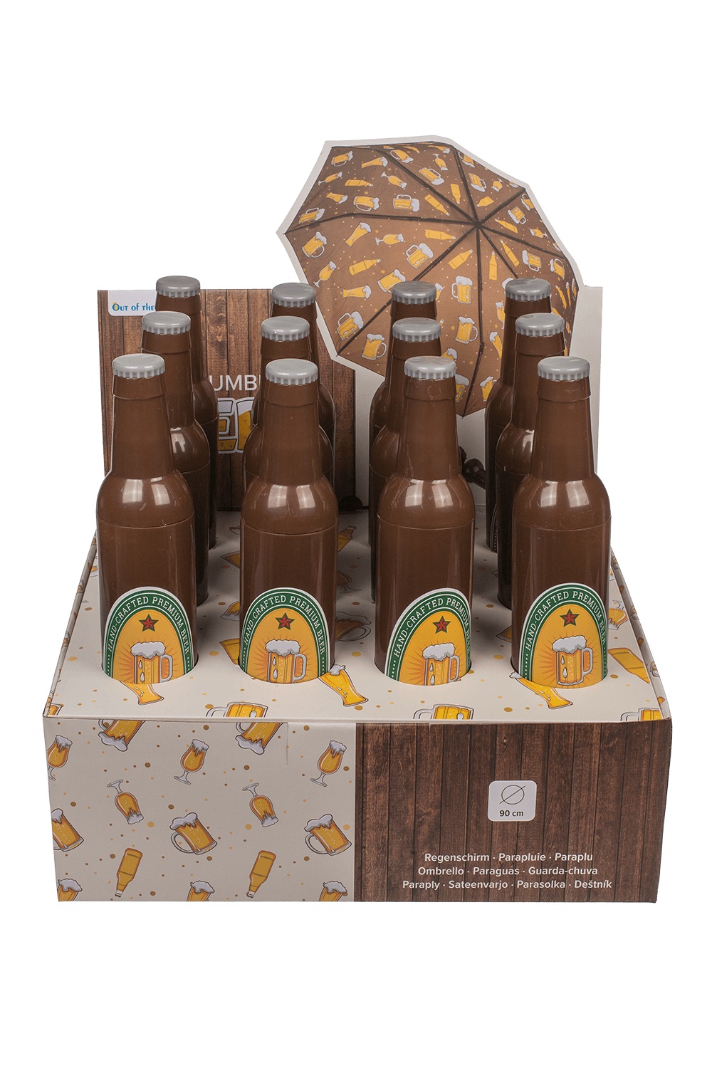 Джобен Чадър в Бутилка Бира - кафяв с принт на бири. Подходящ аксесоар за слънчев или дъждовен ден, парти, карнавал и забавен подарък за любителите на бира.