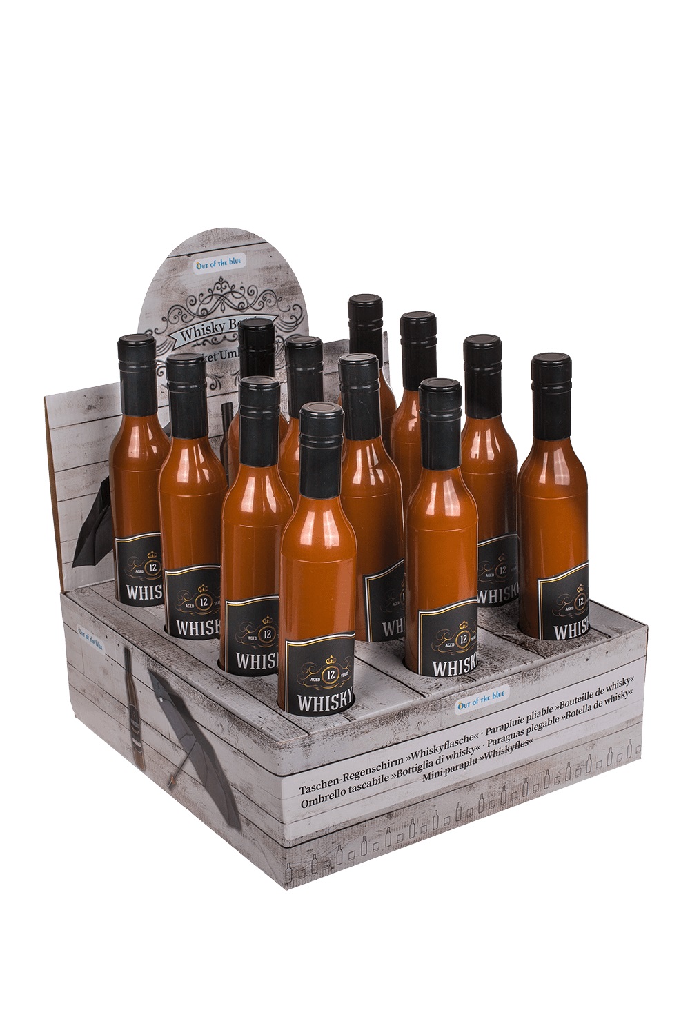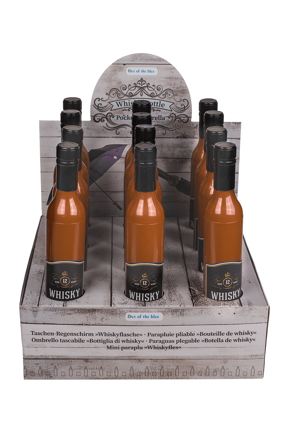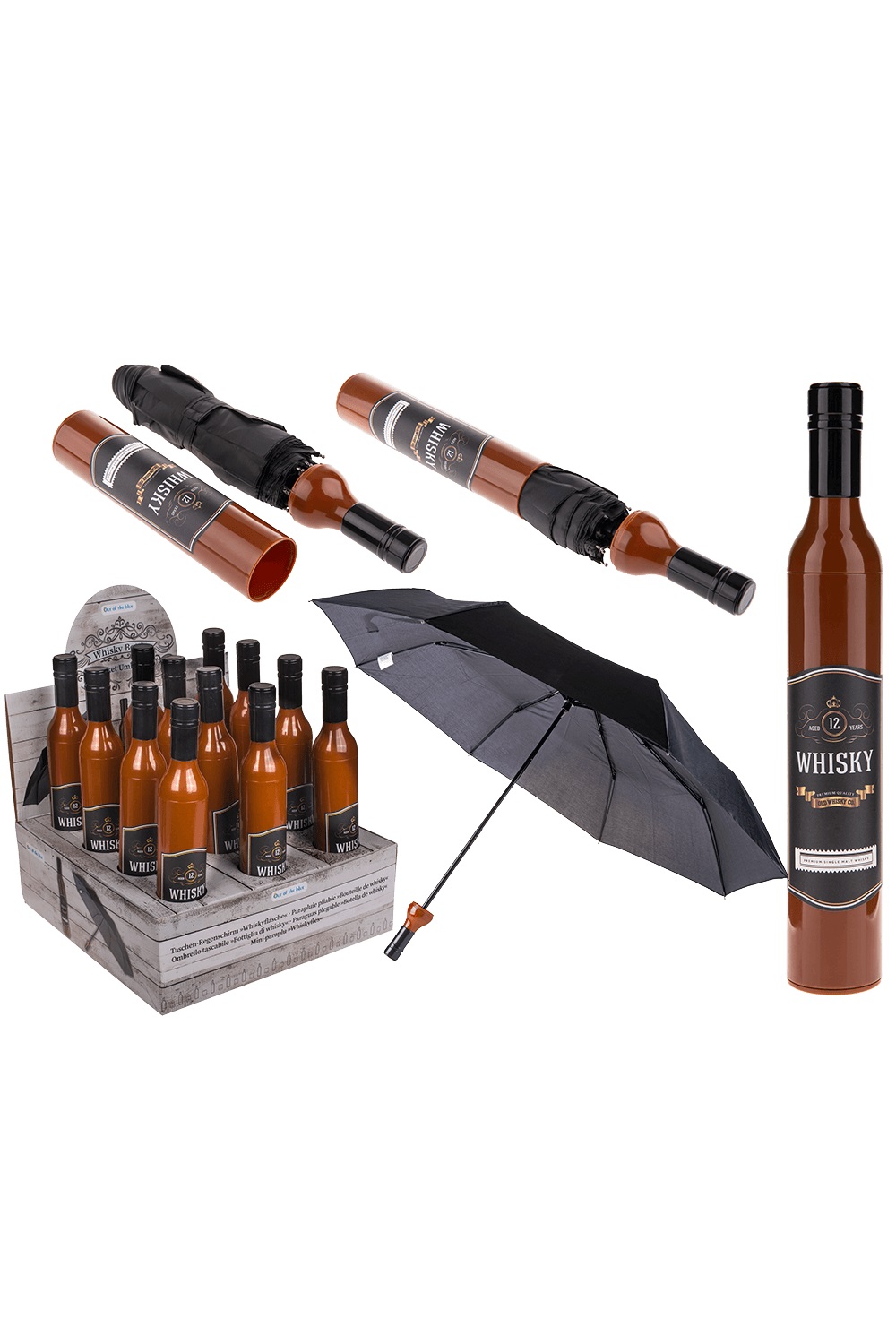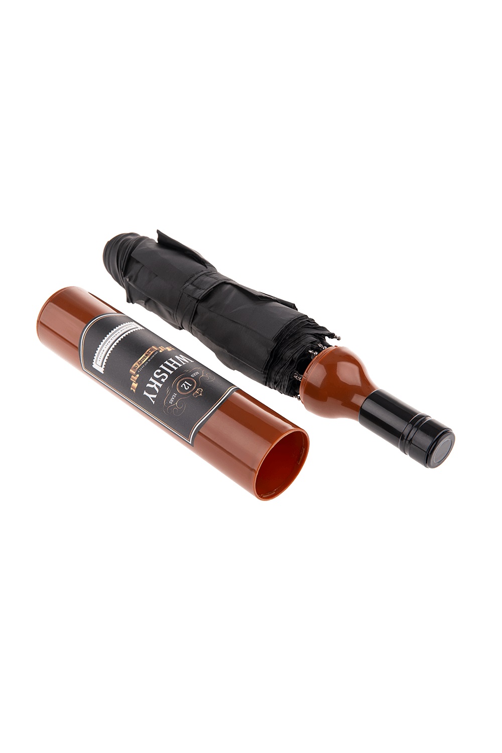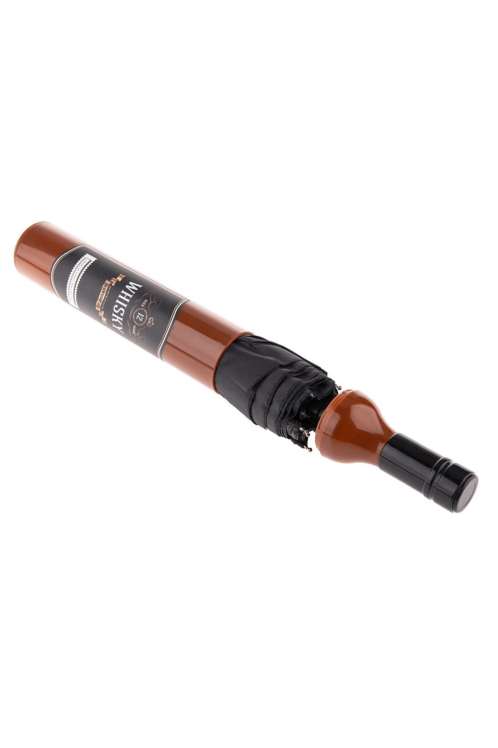 Джобен Чадър в Бутилка Уиски - черен с диаметър 90 см. Подходящ аксесоар за слънчев или дъждовен ден, парти, карнавал и забавен подарък за любителите на уиски.