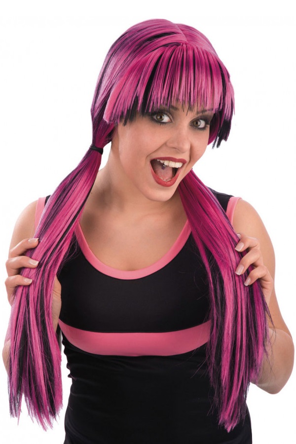 Перука Мис Дракулина, дълга с бретон и опашки, в розово и черно е изработена от изкуствен косъм. Подходяща е за Хелоуин, Коледа, Нова Година, маскарад, училищни празненства, парти, бал с маски и забави.